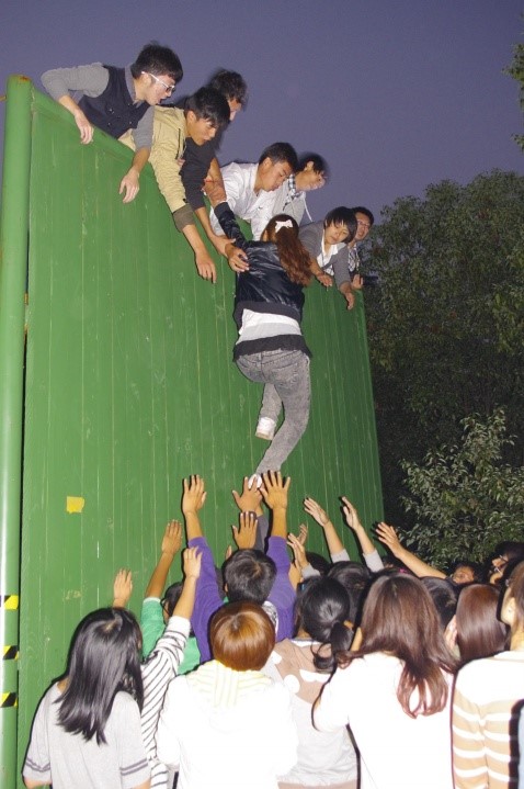 素质拓展的压轴项目是徒手翻阅求生墙,这要求全体同学在徒手的情况下翻越高达四米的求生墙。八个分队再次合为一体,大家团结协作,下搭人梯上伸援手,一个接一个地将同学们安全地运送到四米的高墙上,一百多人仅用二十七分钟就完成了这项艰巨的任务。