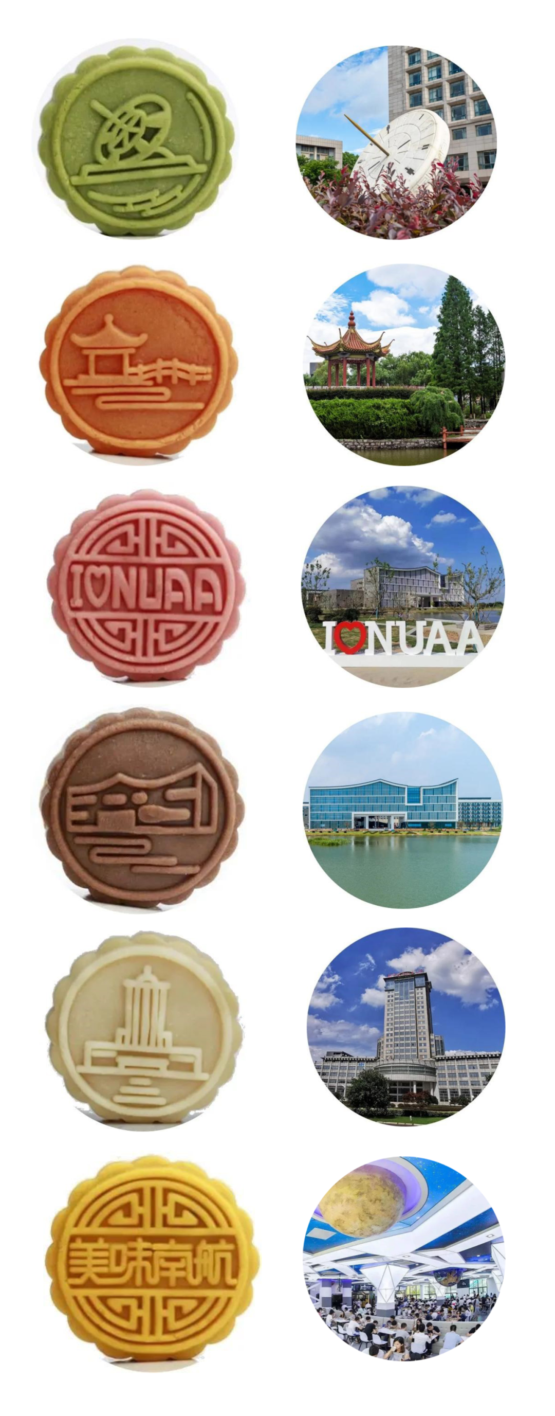 “我们这次的南航月饼礼盒一共有六枚月饼,每一枚月饼都有自己独特的图案。除了美味南航和I love nuaa以外,其他四枚的图案设计灵感都是来自于我们三个校区内具有代表性的风景,分别是将军路校区的主楼、天目湖校区的巡天楼、明故宫校区主楼前的日晷、以及明故宫校区的东华湖。”纪昀介绍道。
