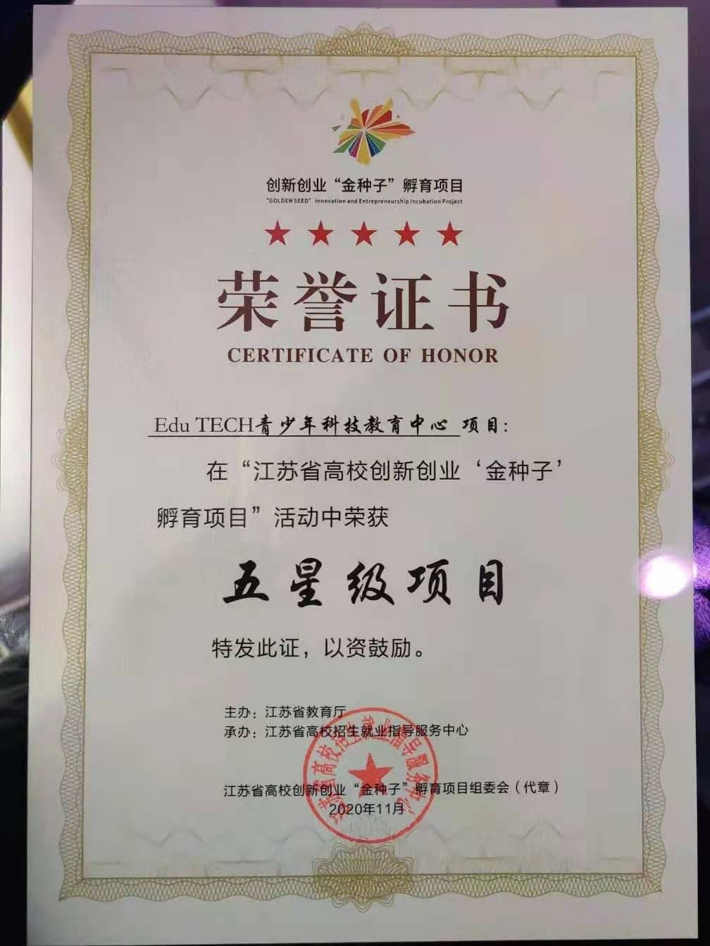11月28日,由江苏省教育厅主办,省高校招生就业指导服务中心、扬州大学承办的全省高校创新创业“金种子”孵育项目颁奖仪式在常州举行。 国产成人视频 “Edu TECH青少年科技教育中心”创业项目获评五星级项目,并被授予“金种子”称号。