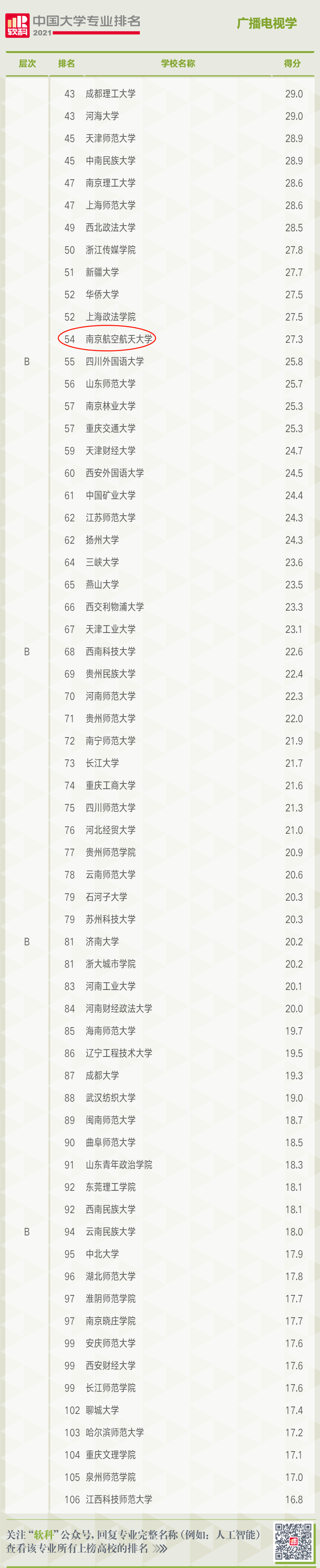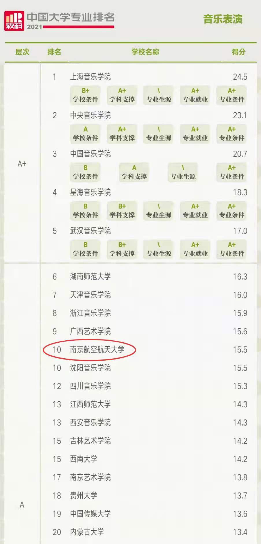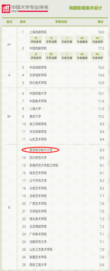 南航国产成人视频 的四个本科招生专业在此次排名中成绩突出,音乐表演专业进入A层次(2%-10%,排名全国第10位,全国共有149所高校上榜),环境设计专业进入A层次(2%-10%,排名全国第66位,全国共有401所高校上榜),戏剧影视美术设计专业进入B层次(20%-50%,排名全国第13位,全国共有28所高校上榜),广播电视学专业进入B层次(20%-50%,排名全国第54位,全国共有106所高校上榜)。