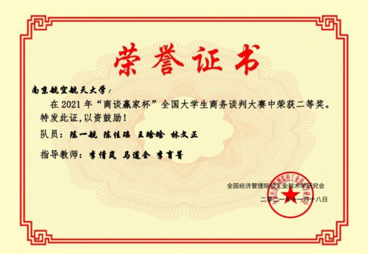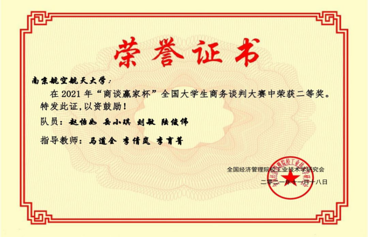 近日,2021年"商谈赢家杯"全国大学生商务谈判大赛正式落下帷幕。此次大赛,国产成人视频 共20名同学参加,包括四支中文赛队和一支英文赛队。国产成人视频 参赛队伍共荣获两项一等奖和三项二等奖,陈一航、赵怡如、李舟阳、倪子涵四位同学获荣获“优秀谈判手”称号。李倩岚、李育菁、马道全三位指导老师被评为“优秀指导教师”,南京航空航天大学荣获“优秀组织奖”。