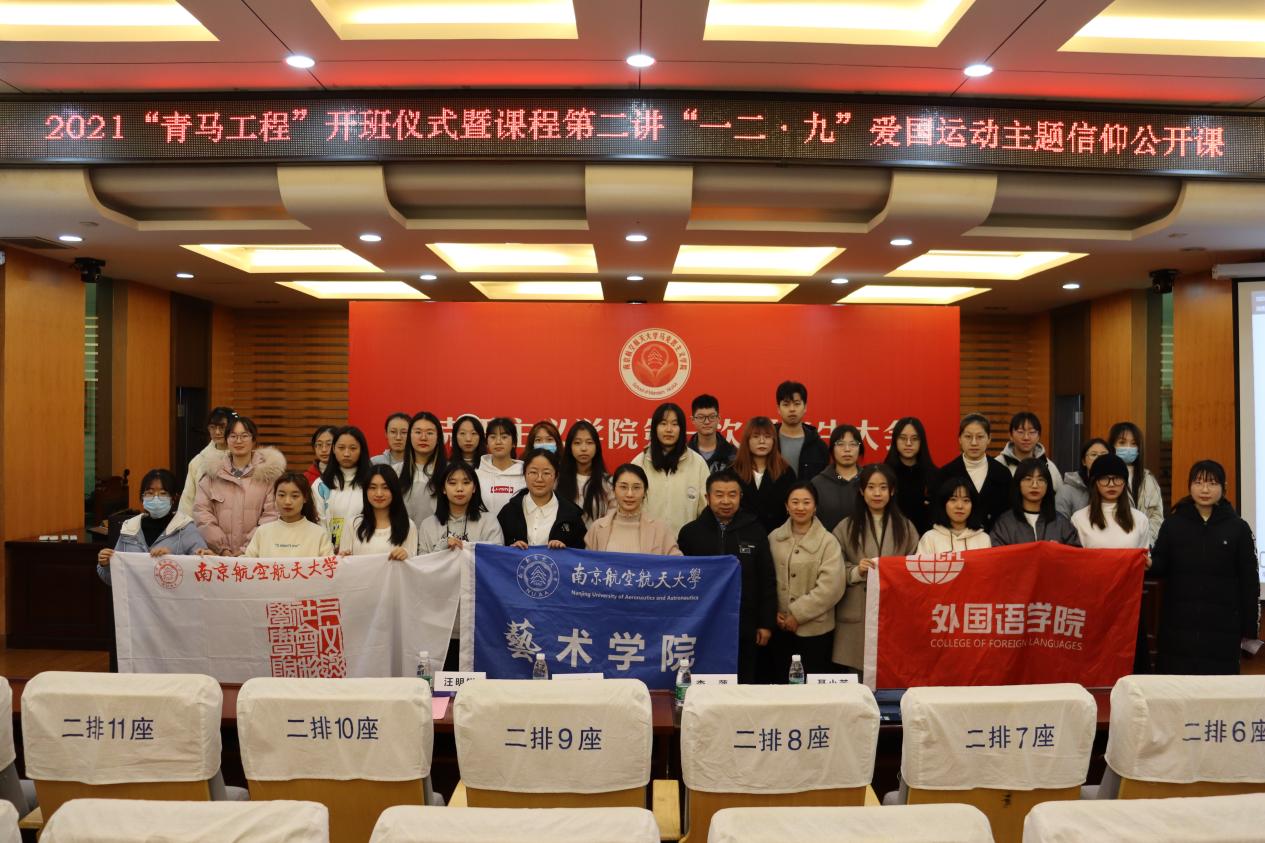 12月9日,2021-2022学年人文与社会科学学院、国产成人视频 、外国语学院“青马工程”培训班开班仪式暨“一二·九”爱国运动主题信仰公开课在人文学院模拟法庭成功举行。马克思主义学院副教授潘银良、外国语学院团委书记李萍、人文与社会科学学院本科生辅导员聂小芳、国产成人视频 研究生辅导员汪明锐与本期全体青马班学员共同参与活动。