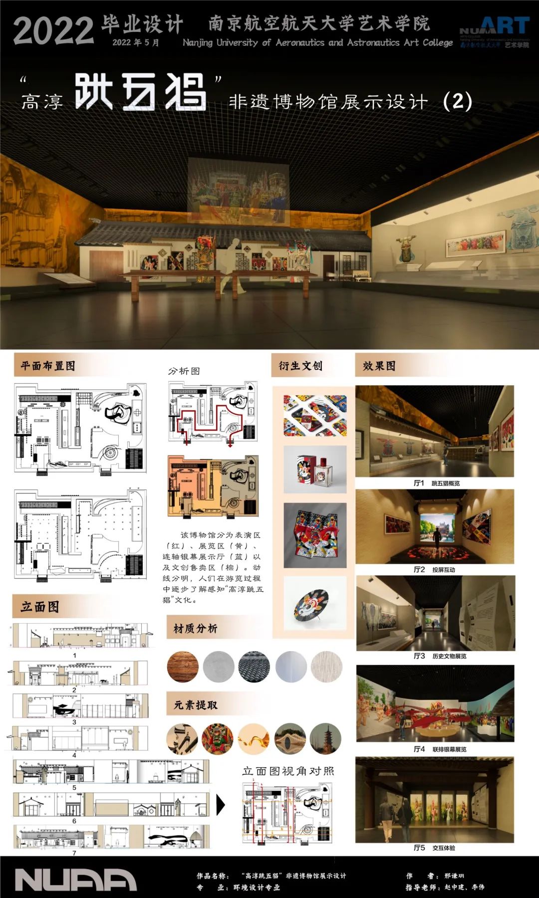 该毕设项目是高淳跳五猖非遗博物馆展示设计。希望能够借此主题弘扬“高淳跳五猖”非物质文化遗产。