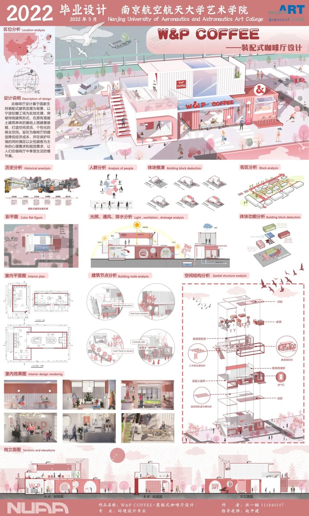 此咖啡厅设计基于国家支持装配式建筑发展为背景,以宁波拉糖工场为实地支撑,突破传统建筑形式,在原有混凝土建筑单体的基础上搭建集装箱,打造空间灵活、个性化的商业空间。旨在为咖啡厅的建造降低经济成本,并在保护环境的同时满足以女性顾客为主体的心理需求和视觉需求,让人们在咖啡厅中享受生活的慢节奏。