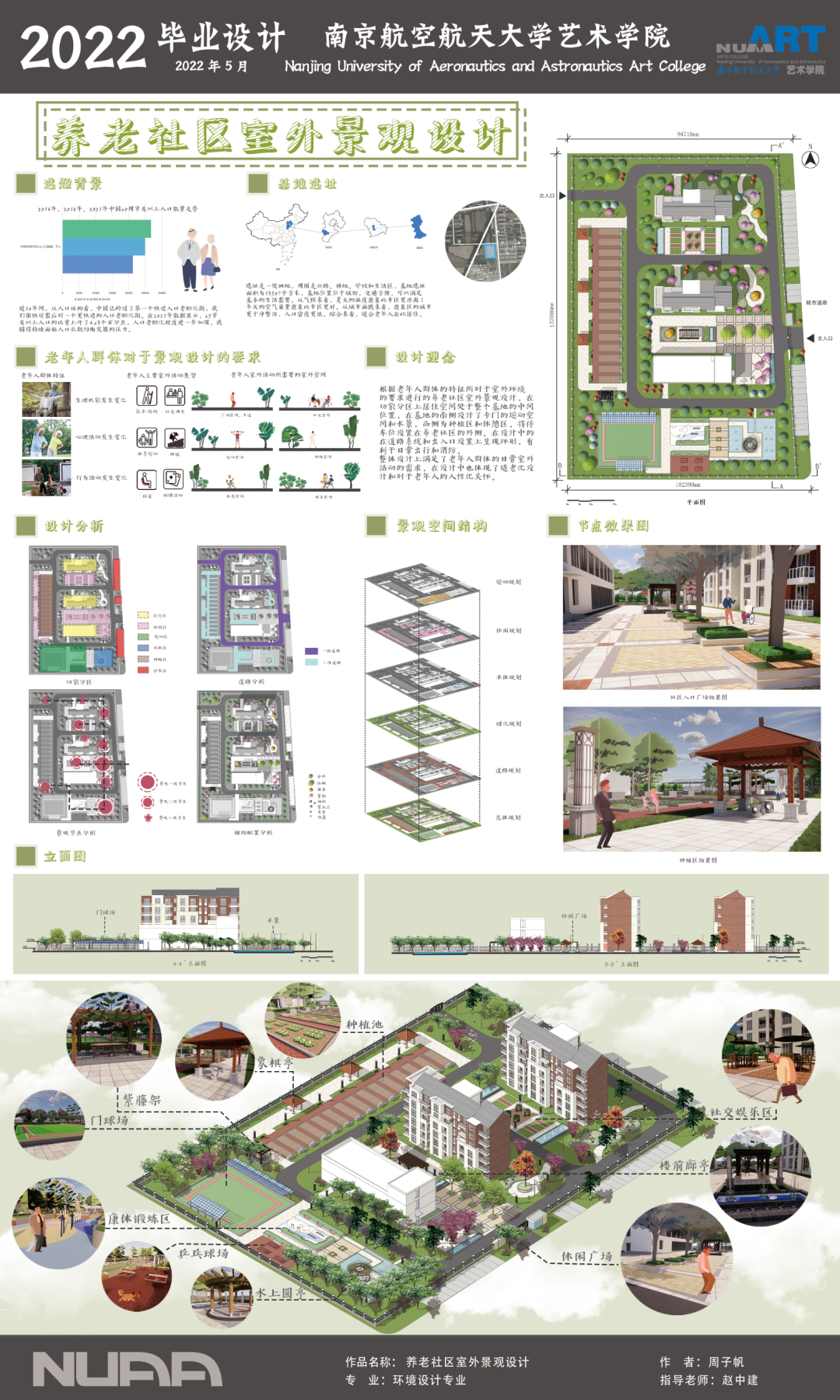 本设计旨在规划设计一个养老社区的室外景观部分,在符合老年人行为特征的基础上,构成一个较为完整的养老景观设计体系。
