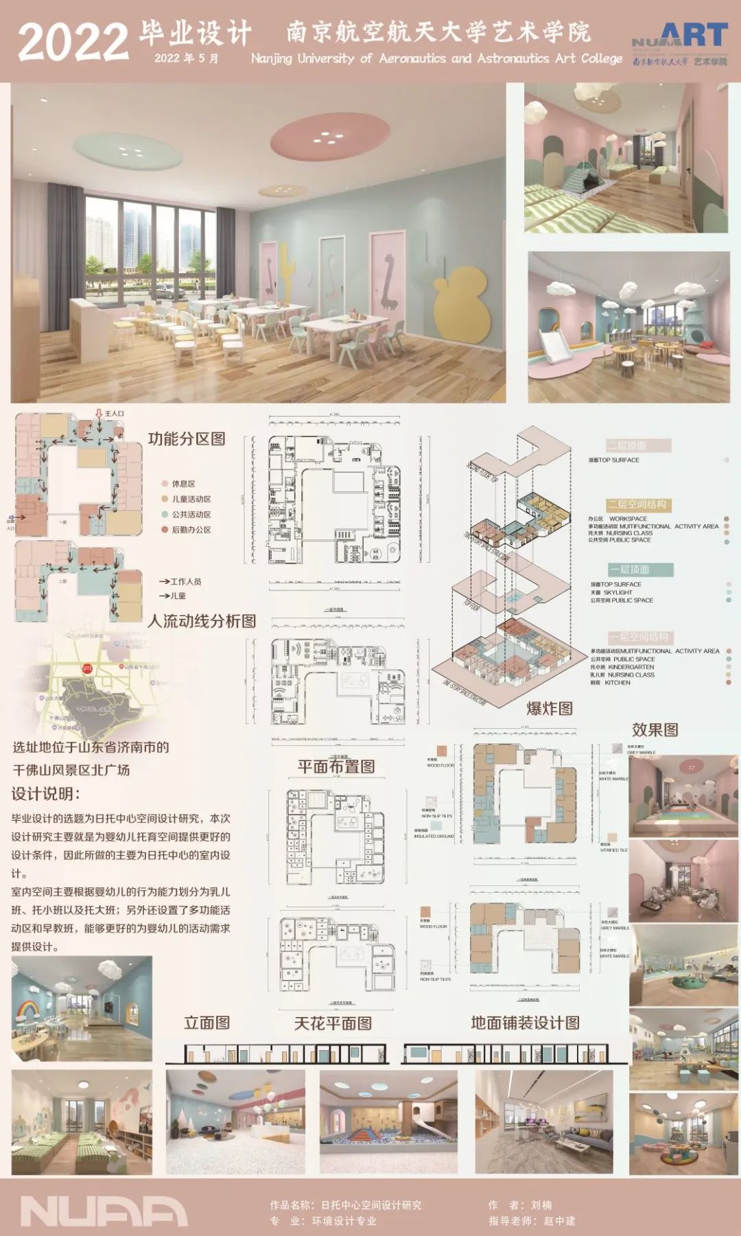 本设计作品为日托中心空间设计,选址地位于山东省济南市千佛山风景区北广场,设计研究目的就是为婴幼儿托育空间提供更好的室内空间环境,因此作品主要为日托中心的室内设计。根据婴幼儿的行为能力将空间划分为乳儿班,托小班,托大班,以班级为一个生活单元,单元内部包含活动区,休息区,更衣室,盥洗室和卫生间,此外还设计了公共活动空间和多功能空间,为婴幼儿创造出具有舒适性和自主性的日托中心室内空间设计。