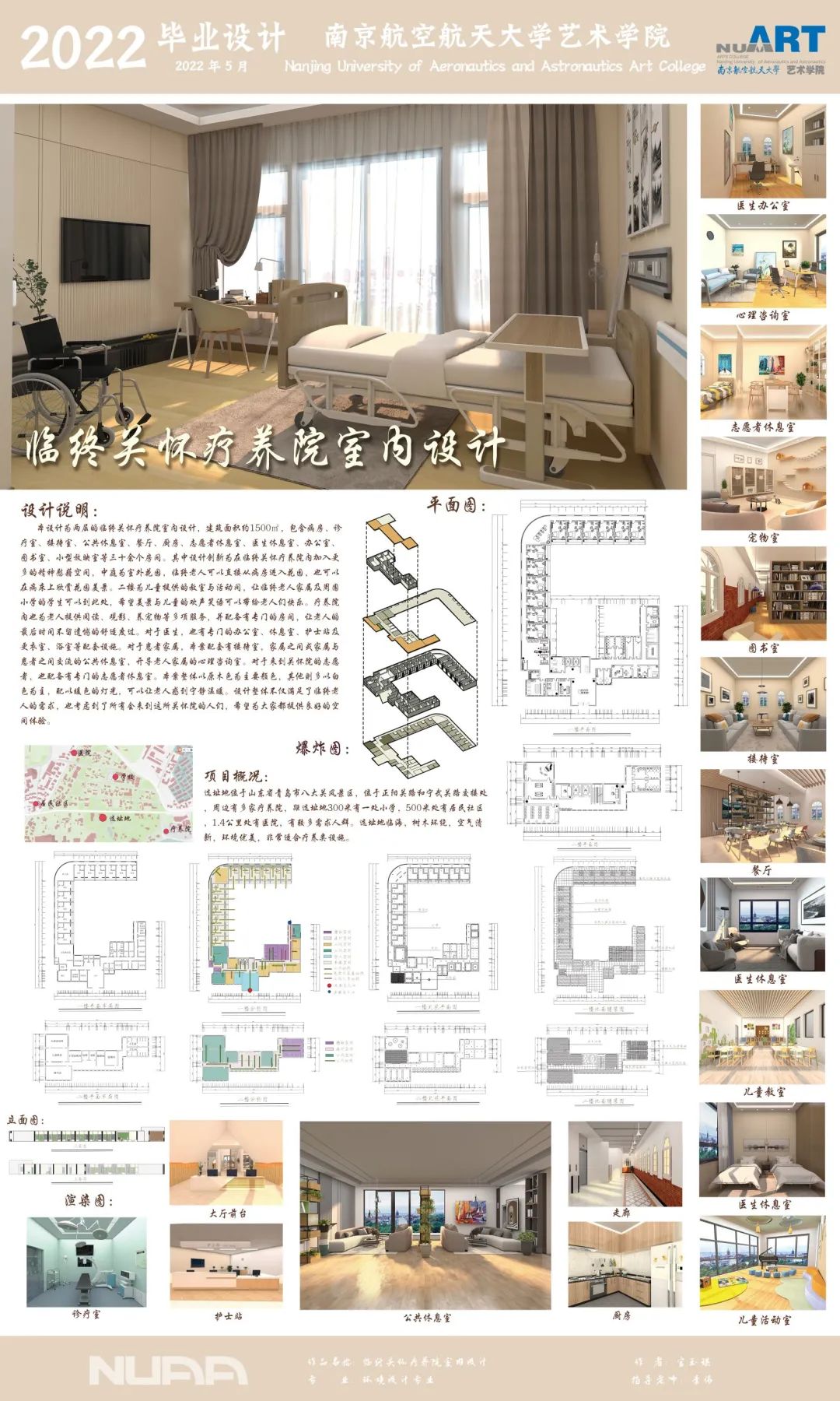 本设计为两层的临终关怀疗养院室内设计,建筑面积约1500平方米,包含病房、诊疗室、接待室、公告休息室、餐厅、厨房、志愿者休息室、办公室、图书室、小型放映室等三十余个房间。其中设计创新为在临终关怀疗养院内加入更多的精神慰藉空间,中庭为室外花园,临终老人家属及周围小学的学生可以到此处,希望美景与儿童提供的欢声笑语可以带给老人们快乐。