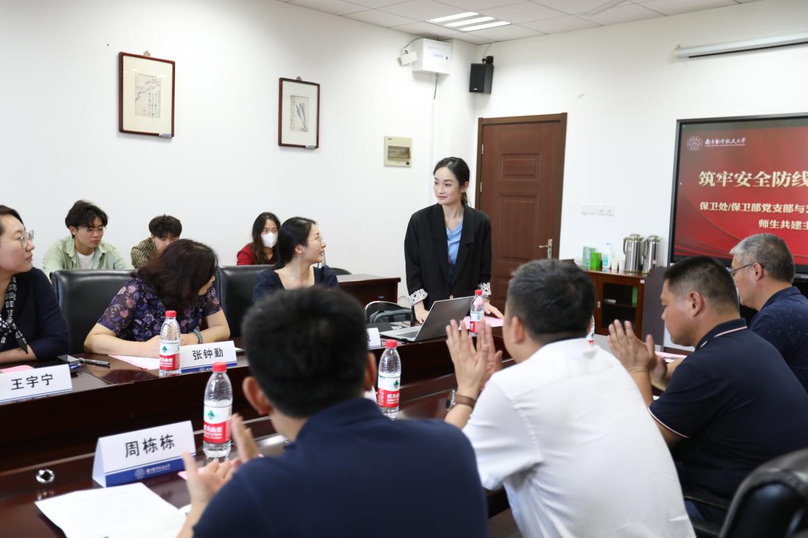 6月17日下午,国产成人视频 音乐学学生党支部与保卫处/党委保卫部党支部开展了党日共建活动,活动主题为“筑牢安全防线,共享平安校园”。保卫处处长徐曙峰、副处长周栋栋,国产成人视频 党委书记张钟勤、副书记王宇宁出席活动,两个支部30余名师生党员参与活动。会议由国产成人视频 团委书记汪明锐主持。