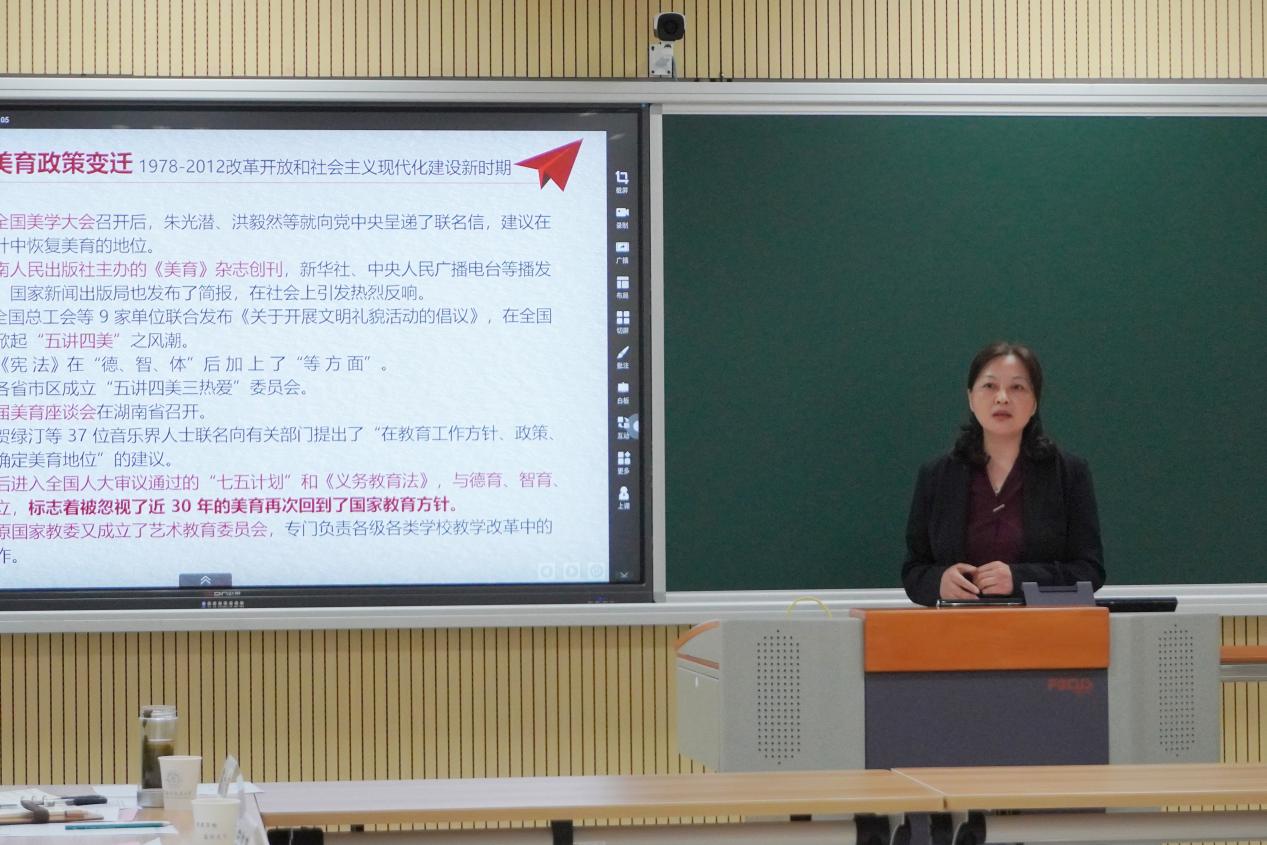党委书记张钟勤以“建党百年美育政策变迁及美育政策”为题,进行了主题报告。她从建党百年以来党的美育政策的变迁入手,介绍了1921年以来党的美育政策的主要内容、特点、和代表性作品,使与会人员全面了解了党的美育政策的发展历程,充分认识到党对于美育工作的重视。张钟勤详细解读了党中央、国务院发布的《关于全面加强和改进新时代学校美育工作的意见》,并结合学院开展美育工作实践,提出加强学校美育工作的四点思考。一是强化政策制度保障,凝聚工作合力;二是强化分层分类设计,丰富课程资源;三是强化课内课外衔接,深化美育实践;四是强化专业交叉融合,改革培养模式。