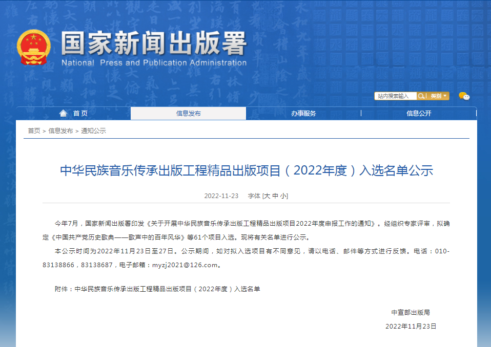 中华民族音乐传承工程精品出版项目由国家新闻出版署组织实施,旨在扶持具有较高价值的民族音乐精品项目,阐发民族音乐文化精髓,铸牢中华民族共同体意识,展现民族音乐时代价值,传承民族音乐红色基因,保护民族音乐珍贵资源,促进文明交流互鉴。国家新闻出版署将对入选项目进行资助,同时将相关项目纳入中华民族音乐传承出版工程服务平台进行宣传推广和开发利用。