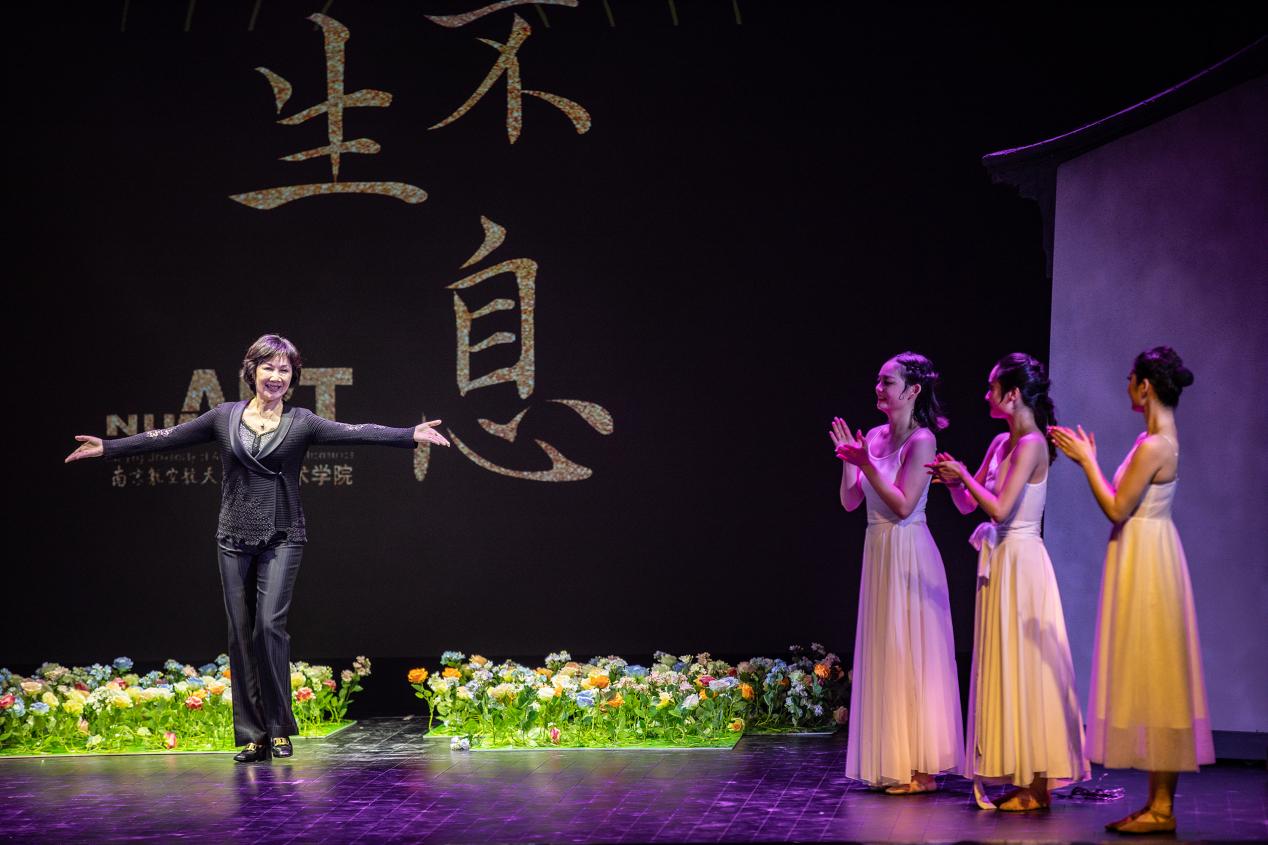 演出中还播放了杨莉莉教授指导学生们练习舞蹈的视频,并深情回顾了25年前的3月29日,杨莉莉教授在南京举办个人舞蹈专场的珍贵画面。作为南航引进人才,杨莉莉教授二十年来一直坚守在美育一线,以她精湛的舞蹈艺术、严谨治学的态度,培养了一批又一批的优秀学子,她对舞蹈的热爱激励着一批又一批的年轻人。