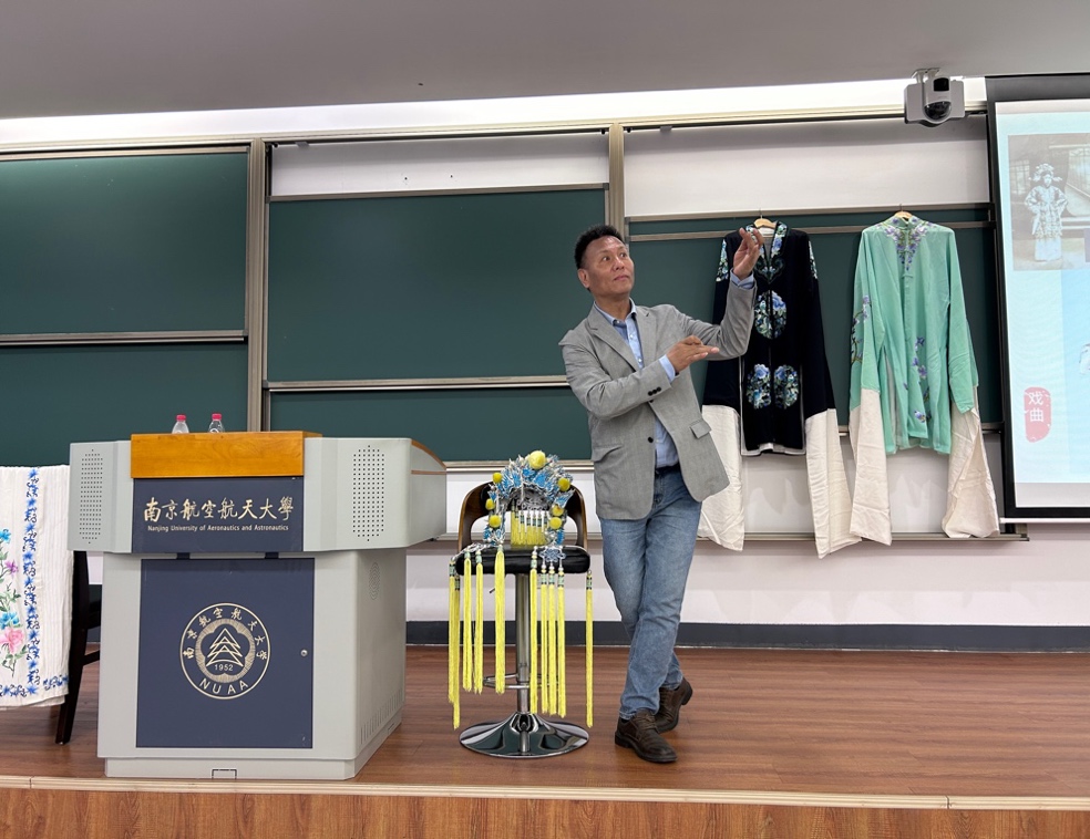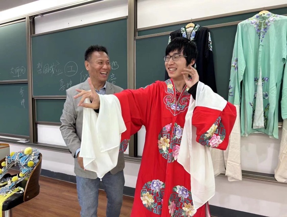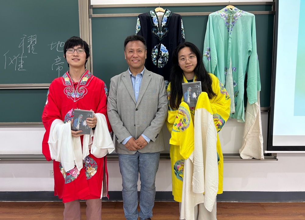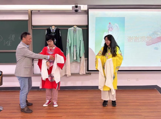 与其他人文社科类课程讲授的方式不同,为让同学们感受名家的现场表演,彭先生还为同学们现场演唱了昆曲《牡丹亭·懒画眉》和京剧戏歌《梨花颂》,并向同学展示了他携带的戏服和头饰,帮助同学们近距离地感受戏曲艺术之美。之后,彭先生邀请两位同学上台,穿戏服、学表演,让他们亲身体验水袖的舞动之美。最后,彭先生还向同学赠送了自己近期出版的个人专辑光盘,并与同学们合影。