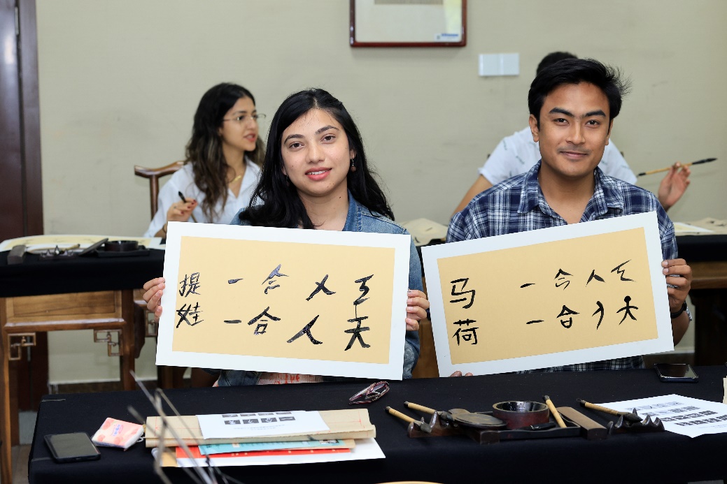 “我是来自尼泊尔的Asmita,在南航读研究生。我一直对中国文化和艺术有着浓厚的兴趣,今天有机会参加书法课真是太棒啦。老师不仅教我们写书法,还教我们书法的历史。书法对中国字的书写方式有着独特的意义。"天人合一”,我现在知道了它是如何用传统书法书写的,也知道了这句话的深层含义。我在这节课上学到了很多,书法写起来不容易,但很有趣,我与朋友们在一起体验很开心,是一次难忘的体验。“