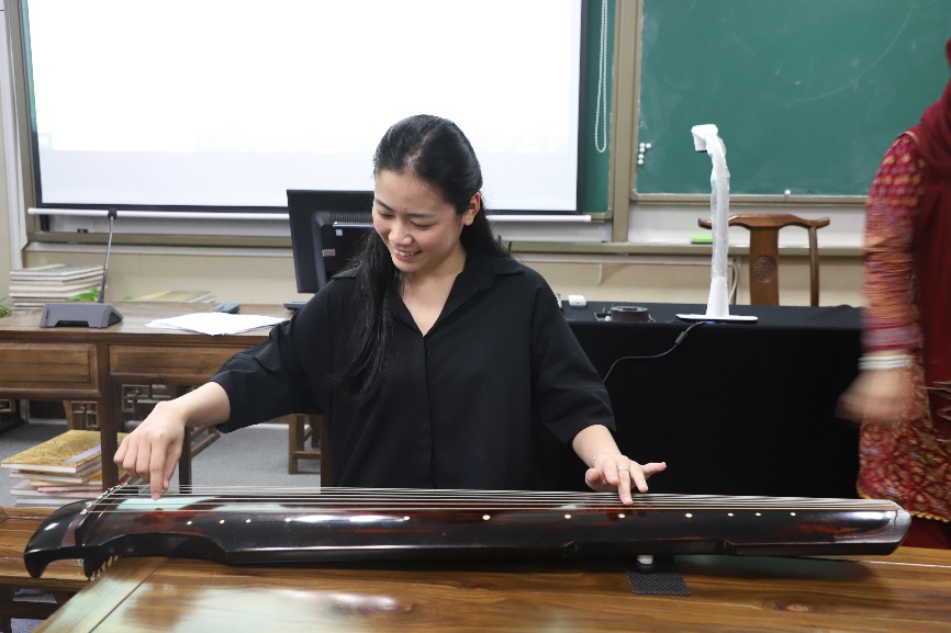 “我是来自印度尼西亚的SINTA ZHENG,目前是研二的一名学生,在这堂中国传统文化课上,“古琴”这种非凡的乐器唤起了人们的情感。古琴被誉为“先贤之琴”,具有深厚的历史渊源和灵性。它梦幻般的旋律和细腻的音调在内心深处回荡,营造出敬畏与宁静的独特融合。
