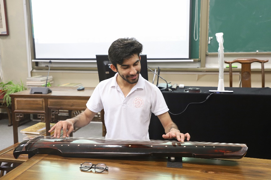 “我是来自比基斯坦的Muhammad sarmad malik,中文名是马德。今天的古琴弹唱课真是一次迷人的经历。当我拿着乐器,小心翼翼地拨动琴弦时,我立刻感到与中国丰富的文化遗产产生了联系。古琴奏出的旋律将我带入了一种宁静和自省的境界。我不仅学到了演奏这种古老乐器的技术方法,还学到了通过音乐捕捉情感本质的重要性。