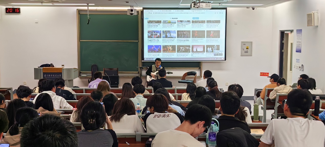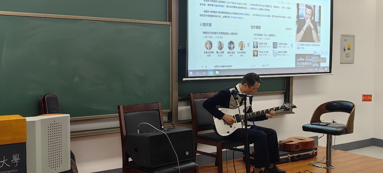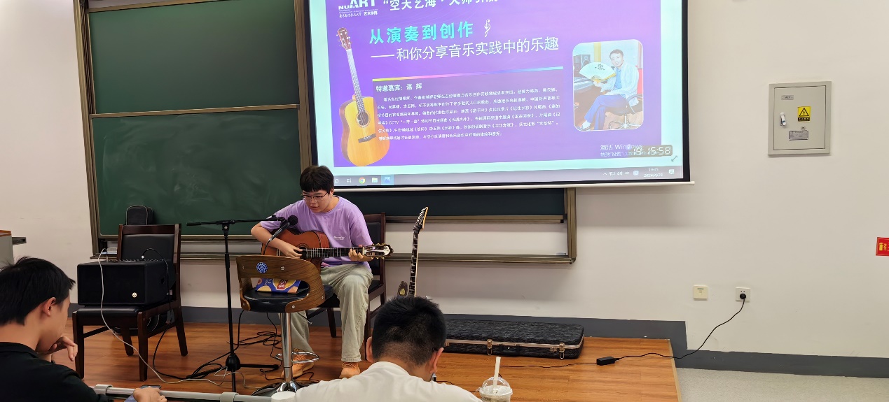 互动活动开始,湛辉为同学们弹奏了《爱的罗曼史》《加州旅馆》等经典吉他曲,接着他讲解了吉他学习的基本要领,之后他还邀请几位同学进行现场弹唱,并鼓励同学们在弹唱的时候要自信,大胆表现。