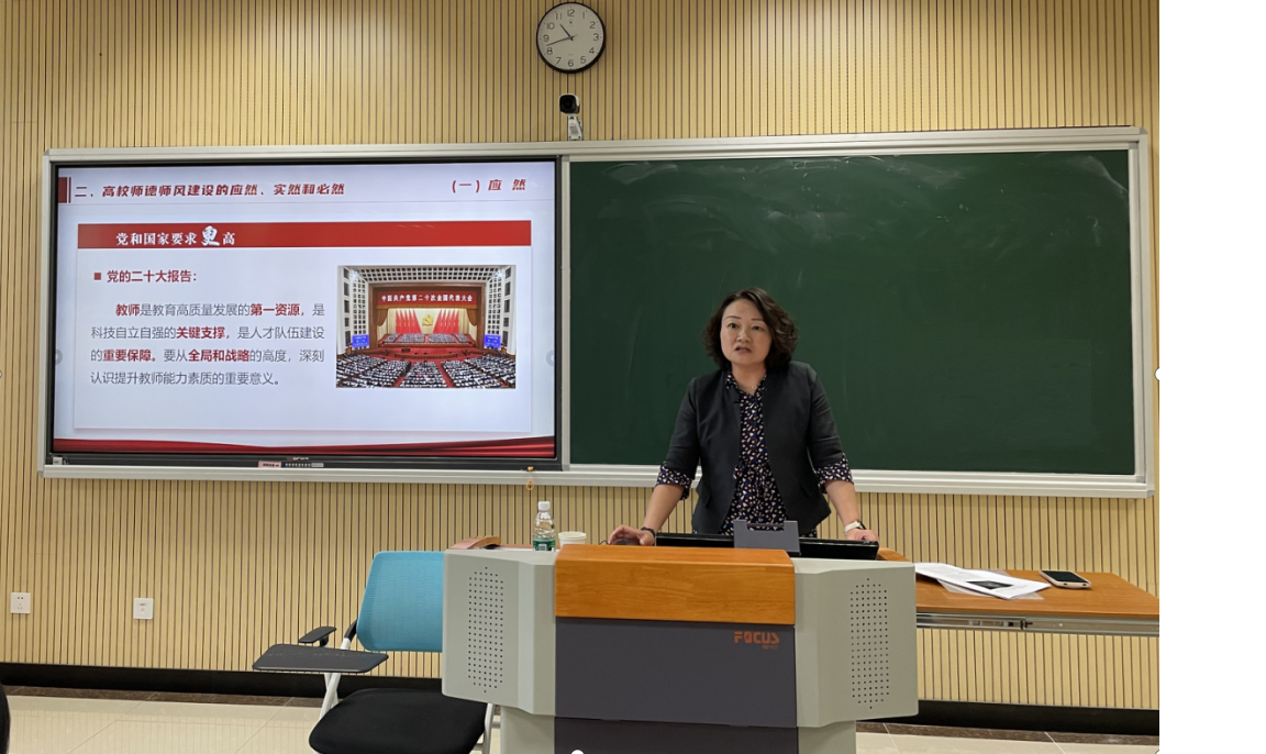 王晖以“我在南航当老师”为题,引导教师们认真思考作为一名南航的老师,身上所承担的使命和责任。她从相关舆情事件说起,指出高校师德师风建设的应然、实然和必然。她带领大家共同学习了习近平总书记关于高校教师队伍建设和文艺工作的重要论述。从宏观、微观两个层面阐述了师德师风建设面临的形势和任务,分析了国产成人视频 教师队伍建设的现状,引领教师重新学习了《新时代高校教师职业行为十项准则》《研究生导师指导行为准则》等规定,并通过列举警示案例,加深了教师们对政策的理解。强调要“热爱”和“敬畏”大学老师这份光荣的职业,坚定立德树人、铸魂育人的职业理想,严守师德师风底线,大力弘扬教育家精神。