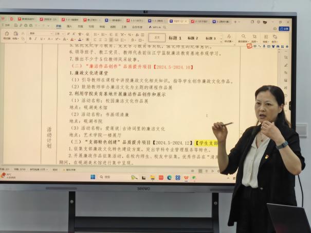 江苏省样板支部、音乐系教工党支部书记汪晓露,围绕发挥党支部工作特点和专业优势,促进党建与业务工作有机融合,加强党支部的标准化、内涵化、特色化建设等方面做了支部建设经验汇报。各支部还结合自身特色,围绕开展好“音诗书画,绘影演展,多元载体建强“艺”廉阵地,涵养“艺”院清风”这一党内重点主题教育项目,进行了充分的研讨。