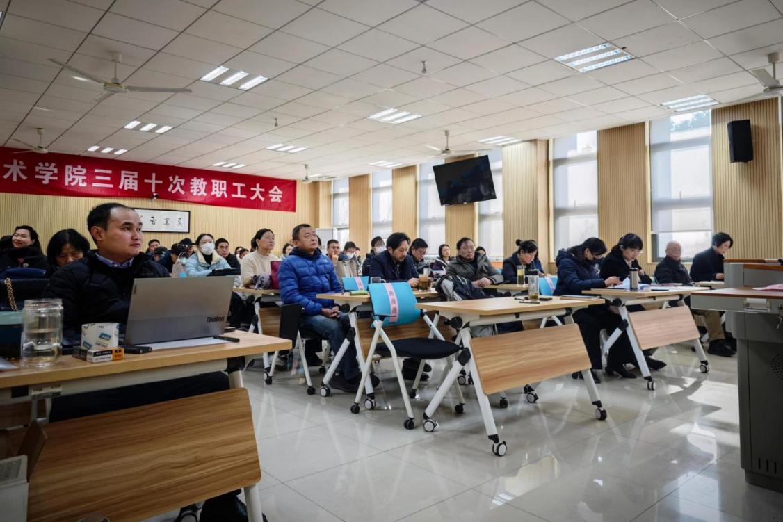 板俊荣代表学院领导班子作工作汇报并作个人述职。他全面回顾了本年度学院在党建引领、教学改革、科研创新、招生就业等方面的工作成果,分析和研判了当前艺术教育领域面临的挑战与机遇,并结合实际情况,明确了学院下一年度的工作目标。他指出,学院将继续深化教育教学改革,持续加强师资队伍建设,不断提升科研能力。他强调,全院上下必须坚持以学生为中心的发展思想,不断提高教育质量,为培养更多高素质艺术人才不懈努力。
