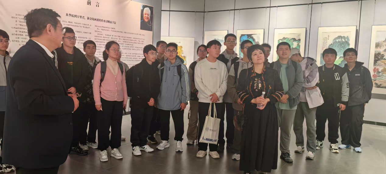 乐曲余音绕梁之际,师生们移步砚湖美术馆,开启课堂教学的第二篇章。在“和平·青绿·传承”中国山水画高校联展的现场,万里君老师亲自导览,细致讲解了其师华拓先生的艺术风格与个人创作心得。她从构图、笔墨与意境入手,结合中西绘画比较的视角,生动剖析了画作的美学追求。板俊荣老师则从校园美育建设的角度,阐述了此类展览对提升学生审美素养的积极意义。同学们在画作前驻足欣赏,与老师交流感悟,艺术氛围浓厚热烈。