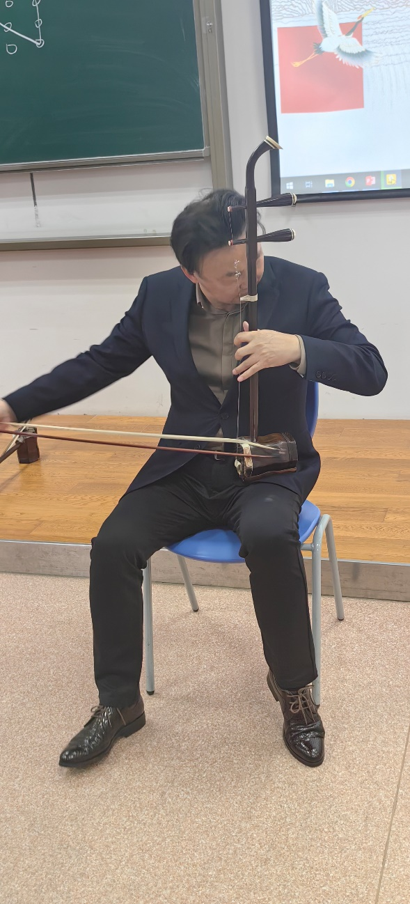 课程伊始,在5201教室,召唤教授以“乐鉴四镜:具有国际内涵的创新民乐”为题开启首篇。他从吹管、拉弦、弹拨、打击四大乐组入手,系统梳理了中国民族乐器的艺术特色,并通过对《紫竹调》、《瑶族舞曲》及现代作品《石窟随想》的对比赏析,拓宽了学生的音乐视野。讲座的高潮是召唤教授的现场演奏,二胡名曲《二泉映月》的哀婉深沉与《赛马》的激昂奔放形成鲜明对比,旋律扣人心弦,赢得全场经久不息的掌声。