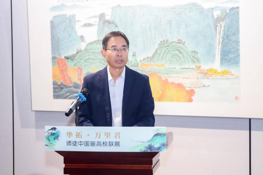 高云称赞展览是“高雅艺术进校园”的一次有益实践。他提到江苏美术底蕴深厚,青绿山水创作难度极高,而华拓作为杰出的青绿山水画大家,其技艺被万里君一脉相承,师徒二人的作品充分展现了中国画的艺术高度。他进一步阐释画山水有眼中山水、胸中山水、理想中山水三重意境,认为华拓的山水画作达到了“理想中的山水”这一最高境界,蕴含着对艺术的深刻追求。