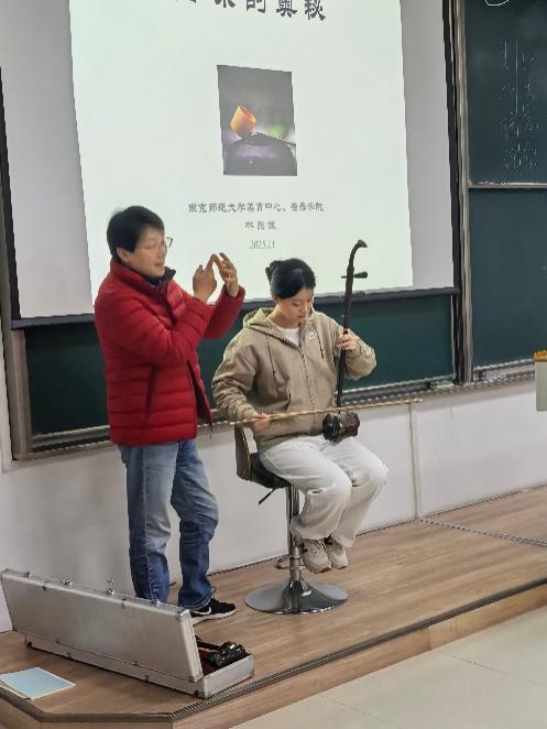 而最让同学们惊喜的,是理论与实践的完美交融。讲至兴处,林教授亲手操琴,现场示范:传统定弦与当代定弦的二胡先后奏响,跨越时代的音色对比直观可感。当耳熟能详的旋律《月亮代表我的心》从二胡弦上流淌而出时,现场同学不禁轻声跟唱,熟悉的歌曲另添风味,瞬间引发现场共鸣。