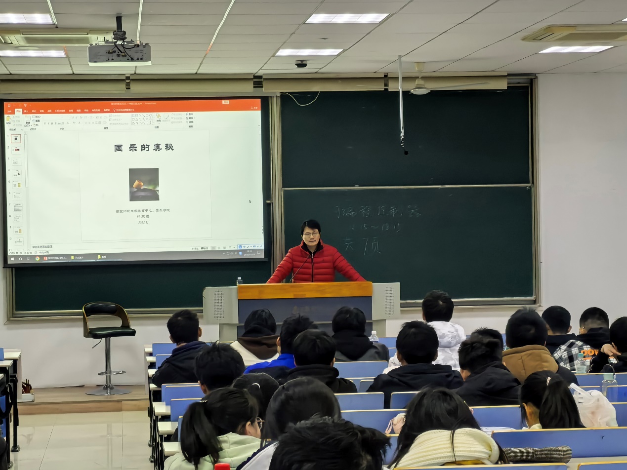 林东坡教授从国乐的定义和缘由出发,引导同学们了解国乐的文化根源,在提振文化自信的同时,推动我国优秀传统文化的传承与发展。之后,林教授从“国乐之特征”“国乐之美的成因”到“国乐的未来展望”层层深入。
