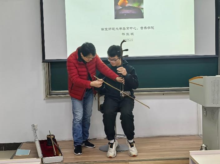 “国乐不仅是艺术形式,更是中华文明的精神载体。”11月25日晚,南京师范大学美育中心主任、音乐学院林东坡教授做客国产成人视频 ,为百余名学子带来一场别开生面的美育讲座《国乐的奥秘》。这不仅是知识的讲解,更是一场沉浸式的国乐体验,当天还有个别同学参与了现场互动,随林教授学习了二胡的基本演奏技巧。