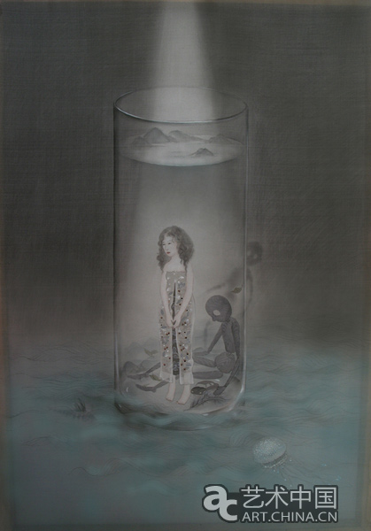 赵丽娜的绘画保留了工笔的细腻美感,清冷淡蓝的色彩总有梦幻般的感觉,是现实与梦的交织。她以女性特有的敏感触觉,将生活遗落的“碎片”、“游戏拼图”简化抽象纷繁复杂的现实,进入梦幻遐想的“超空间”,神情淡定的美丽女孩和没有任何性别显示与表情的玩偶出现在了她编织的梦幻场景之中,玩偶是现实女孩梦中的化身,他们在这里相遇与嬉戏。幻想是女孩子的天性,幻想之外更多的是对现实生活不确定的真实感触。