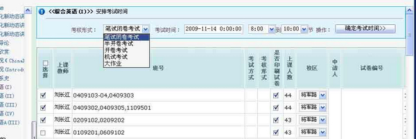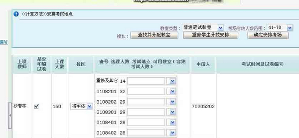 多年考试组织管理的实践经验,教务处新开发了本科生考试管理系统。目前,对于非集中停课课程的考核(即课程结束后的考核),从本学期开始,老师可随时随地自主上网申请组织考核。明故宫、将军路校区的学生及老师均可上网查看课程考核安排。现将任课教师、教学单位、学生的操作流程、总体要求、操作要点说明如下。 一、 任课教师操作流程、总体要求、具体操作要点说明 1、操作流程式: 进入教务系统―→考试时间申请―→考试地点申请―→查看/打印考试安排―→打印送印单及试卷标签 2、总体要求: 1)为确保监考安排、网上发布、试卷送印等后续考务组织工作顺利进行,申请教师务必在课程结束两周前完成本项操作。 2)对于同一门课程具有多位任课教师,需共用一套试卷且同时组织考核,由一位任课教师同时完成考试时间及地点申请操作。 3)完成考试时间和地点申请操作后,任课教师均可查看/打印考试安排信息。 4)考试前一周,申请教师方可打印试卷送印单、试卷标签及考生签到表(带照片)。试卷送印地点遵照以往要求执行,若有变动另行通知。 3、具体操作要点说明 图一 1)“考核形式”为下拉式菜单,申请人可根据课程考核要求,选定相应的考核形式; 2)“是否共用一份试卷”中,“是”或“否”的选择说明: 申请人进入系统时,默认情况为“否”。 “否”选择项说明:凡同一门课程(课程号相同)的一位或多位任课教师,需在同一时间组织考试,且共用一套考卷,即可委托其中一位任课教师完成考试时间及地点申请。 “是”选择项说明:只有在如下示例情况下,才选择“是”选项:例如“张三”老师已成功申请考试时间及地点,“李四”老师事后得知,并想同时且共用“张三”老师的考卷,请选择“是”。此项操作必须使用“张三”老师的教务帐号完成“李四”老师所有班级的考试申请,从而确保系统提供同一个试卷编号,老师提交一套考卷。 3)选择考核形式为“大作业”的课程,完成图一操作即可。 4)申请人可根据图二窗口,再次确认“考核形式”、“考试时间”,若有误还可修改。 5) 在图二窗口的“选择”列中,选择参加考试班级。最后点击“确定考试时间”按扭,完成课程考试时间的申请。 图三 4)需用特殊地点组织考试的(如机房、舞蹈房、各学院专用教室等),申请人务必先落实考试地点的情况下,自己手工输入考试地点。 5)所有笔试考试课程,请点击“查找并分配教室”,系统自动匹配合适的考场。若对系统自动匹配考场不太满意,申请人可自行选择系统提供的教室。 6)教室后面括号内的数字[如2101(85)]为该教室最大容纳考生人数,若考生人数超过教室最大容纳人数,则考试地点申请不能成功。 7) 对于上课人数太多或重修生需单独安排考试地点的,请点击“重修学生分散安排”,后,再点击“查找并分配原则教室”。 二、各教学单位操作流程、总体要求 1、操作流程 1)进入教务系统―→监考安排―→查看/打印考试安排 2)进入教务系统―→监考安排―→撤销考试申请 2、总体要求 1)委派监考前,核查考试地点是否合理。不合理的情况下,对课程和学生均为本院,教学单位负责人可进行“撤销考试申请”,退回到“考试时间申请”或“考试地点申请”状态。若涉及其它学院,请与考试中心联系。 2)为确保考试信息网上发布、试卷送印等后续考务组织工作顺利进行,各教学单位务必在考前一周完成监考委派并落实到位。 3)监考委派原则:开课教学单位委派主监考;相关学生所在院按要求完成副监考委派。 4)在“查看/打印考试安排”中的所有课程均为已上网发布课程,若有变动,请提交书面材料到考试中心。 三、学生操作 1、操作流程 进入教务系统―→查看/打印考试安排 2、要求说明 所有考生务必上网查看考试课程、考试时间及考试地点,按要求准时参加考试,不能随意进入其它考场参加考试。 四、考试管理系统开发说明 本着以规范化、信息化、科学化地组织本科生课程考核的原则,以为全校广大师生及管理人员提供方便、准确的考务组织与管理信息为宗旨,从本学期开始,逐步实现和应用此本科生考试管理系统,热诚欢迎广大师生及管理人员提出宝贵意见及建议,以便我们进行改进和完善,更好地为您提供最优质地服务。 联系单位及电话:教务处考试中心 84891212。 教务处