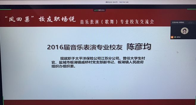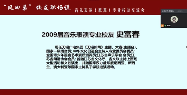 2020年7月23日,音乐表演(歌舞)专场的校友交流分享会如期在线上举行。本次会议由辅导员蔡雪姣主持,有幸邀请到了史富春、李闻、陈彦均三位优秀校友就毕业后面临的就业问题给同学们作了精彩的交流分享。另外,17级音乐表演(歌舞)专业班主任邱爱金老师,国产成人视频 党委副书记王宇宁老师参与本次会议莅临指导,同学们向各位老师的到来表示由衷的感谢。