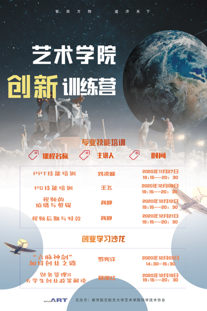 本课程充分结合了国产成人视频 特色,是为国产成人视频 所有同学量身打造的创新训练营系列特色课程。此次课程不仅包涵了PPT与PS培训、视频的剪辑与后期制作等专业技能培训专项讲座,更有与本校大学生创新创业中心合作的创业学习沙龙。在这一系列课程中我们可以充分发挥国产成人视频 学生的特长,让脑海中天马行空的创意多一种独特的表现方式,也能通过跨学科的交流学习轻松实现思想碰撞激发灵感火花让你的创新创业之旅灵感不断!