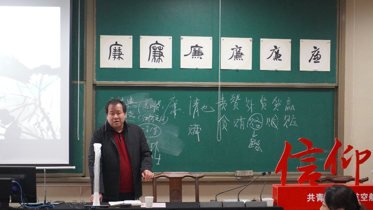 首先,张丕宏结合工作岗位和个人经历,围绕“遵纪守法、廉洁奉公”的主题,从中华传统文化中的“廉”出发,对“廉”的含义进行讲解。张丕宏强调,一是推动廉洁文化建设事关人人,无论是教师还是学生,都应将廉洁意识铭记于心;二是体悟廉洁要懂得自我约束,争做一个正直的人;三是要学法知法懂法用法,提高法律意识、加强法制修养,当好营造廉政建设良好氛围的生力军。