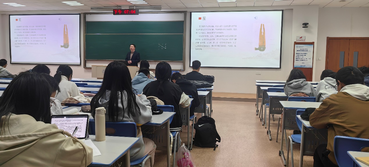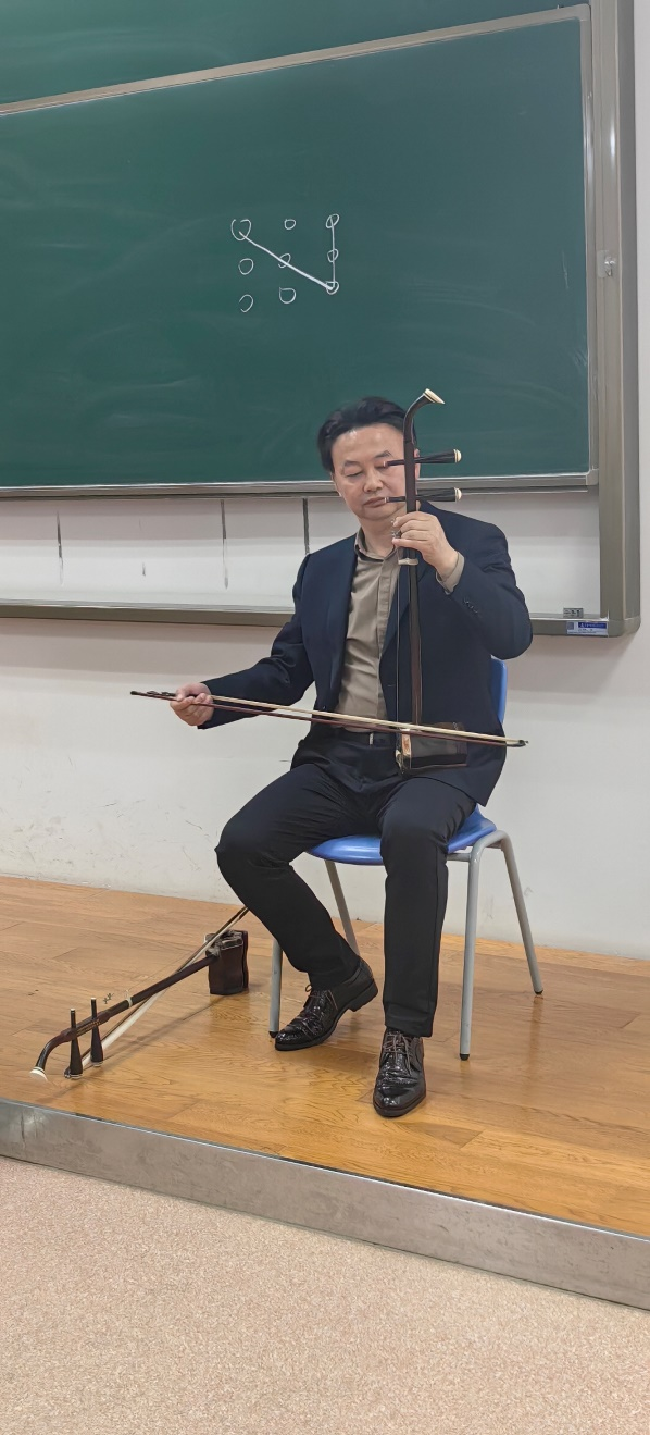 课程伊始,在5201教室,召唤教授以“乐鉴四镜:具有国际内涵的创新民乐”为题开启首篇。他从吹管、拉弦、弹拨、打击四大乐组入手,系统梳理了中国民族乐器的艺术特色,并通过对《紫竹调》、《瑶族舞曲》及现代作品《石窟随想》的对比赏析,拓宽了学生的音乐视野。讲座的高潮是召唤教授的现场演奏,二胡名曲《二泉映月》的哀婉深沉与《赛马》的激昂奔放形成鲜明对比,旋律扣人心弦,赢得全场经久不息的掌声。