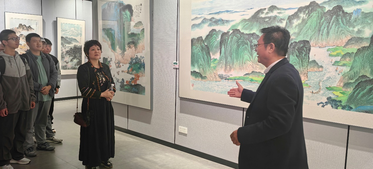 乐曲余音绕梁之际,师生们移步砚湖美术馆,开启课堂教学的第二篇章。在“和平·青绿·传承”中国山水画高校联展的现场,万里君老师亲自导览,细致讲解了其师华拓先生的艺术风格与个人创作心得。她从构图、笔墨与意境入手,结合中西绘画比较的视角,生动剖析了画作的美学追求。板俊荣老师则从校园美育建设的角度,阐述了此类展览对提升学生审美素养的积极意义。同学们在画作前驻足欣赏,与老师交流感悟,艺术氛围浓厚热烈。