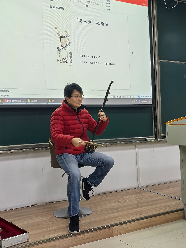 而最让同学们惊喜的,是理论与实践的完美交融。讲至兴处,林教授亲手操琴,现场示范:传统定弦与当代定弦的二胡先后奏响,跨越时代的音色对比直观可感。当耳熟能详的旋律《月亮代表我的心》从二胡弦上流淌而出时,现场同学不禁轻声跟唱,熟悉的歌曲另添风味,瞬间引发现场共鸣。